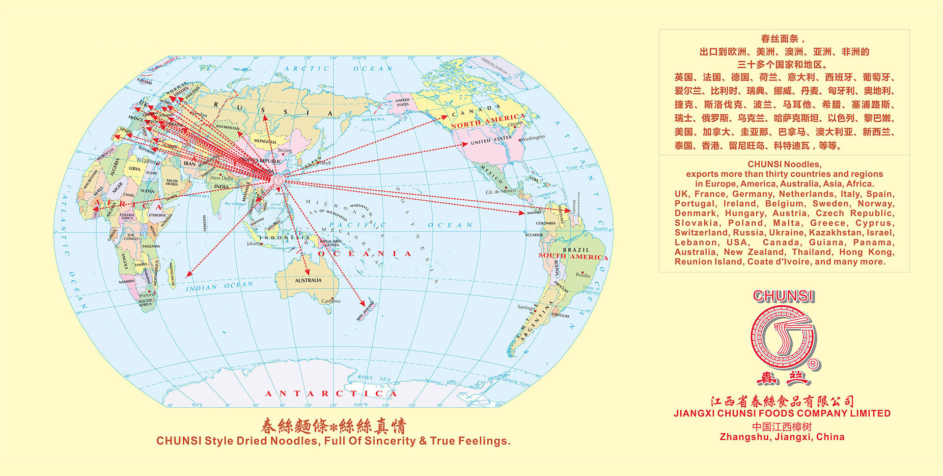 江西省春絲食品有限公司位于江西省樟樹市。 樟樹具有制作面條的悠久歷史傳統。古來即有民謠:“臨江府、清江縣(即樟樹),六歲伢仔會做面。” 今春絲公司是江西省內具有規模的面條、米粉加工企業,也是全國知名的面條生產企業。春絲公司現擁有“春絲”、“凌波仙子”、“絲絲?!薄ⅰ按杭选彼拇笃放?,一百多個品種。所有面條、米粉產品均選用合格原料,符合國家質量和衛生標準。產品具有安全健康、面體勁道、柔韌爽滑、易熟、久煮不糊、不渾湯等特色,深受廣大消費者歡迎。春絲產品已全面進入沃爾瑪、家樂福、樂購、歐尚、好又多、易初蓮花等大型超市,并遠銷美國、日本、英國、德國、法國、西班牙、意大利、葡萄牙、香港等二十多個國家和地區。